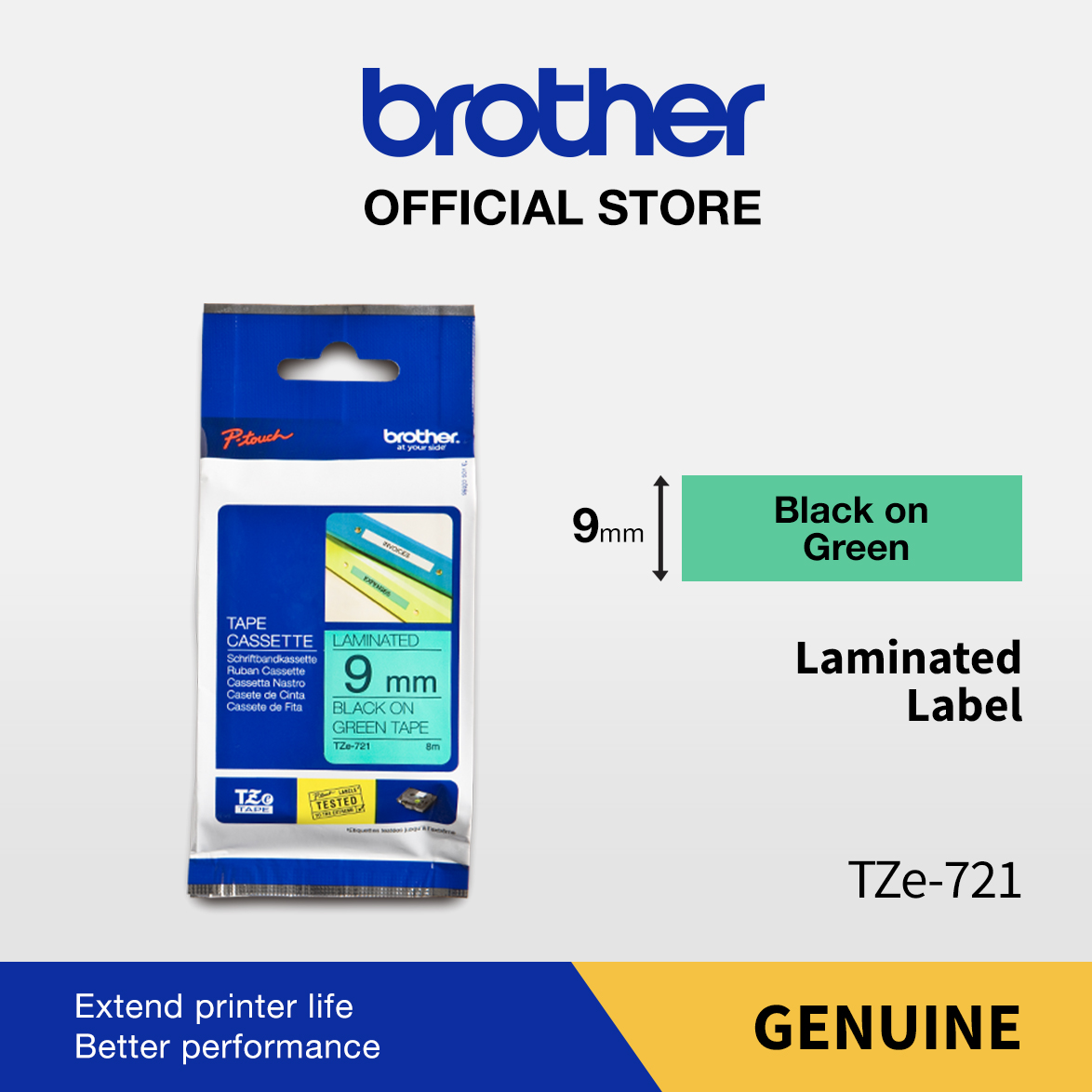 BROTHER COLOR TAPE TZE-721 9MM LAMINATED BLACK ON GREEN