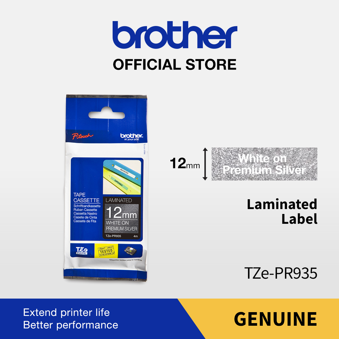 | Brother Label TZE-PR935 White on Premium Silver Tape 12mm x 4m